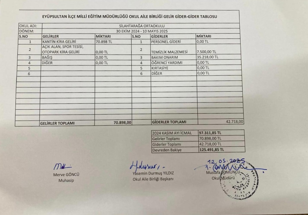 Silahtarağa Ortaokulu Okul Aile Birliği' ne ait gelir-gider çizelgesi yayınlandı.